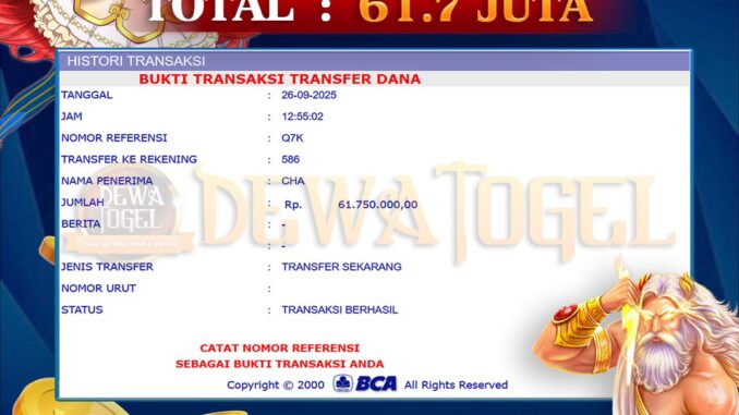 DEWATOGEL mengucapkan selamat kepada user id : CHA*** yang telah berhasil mendapatkan jackpot pada permainan SLOT DI 15.000X MANIA. Kemenangan sebesar Rp 61.700.000,-. telah dibayarkan LUNAS oleh pihak dewatogel kepada pemilik user id setelah yang bersangkutan mengisi formulir withdraw. Proses pencairan dana berlangsung sangat cepat hanya dalam waktu 5-10 menit sudah berada dalam rekening pemilik user id. Bukti transfer yang dapat anda lihat adalah bukti SAH / VALID yang langsung di dapatkan melalui bukti transaksi dari Bank yang digunakan untuk pengiriman dana pada rekening pemilik user id. Terima kasih kami sampaikan kepada para pengguna setia DEWATOGEL yang telah menggunakan situs kami, sebagai Bandar Terpercaya yang pastinya membayar semua kemenangan member hingga lunas. Apakah DEWATOGEL PENIPU ? Reputasi “DEWATOGEL TERPERCAYA” sudah sangat melekat. puluhan hingga ratusan ribu pengguna setia DEWATOGEL tetap menggunakan situs terbesar dan terbaik di Indonesia ini. Hapus rasa was-was dan khawatir anda, kemenangan anda berapapun PASTI dibayarkan hingga lunas.